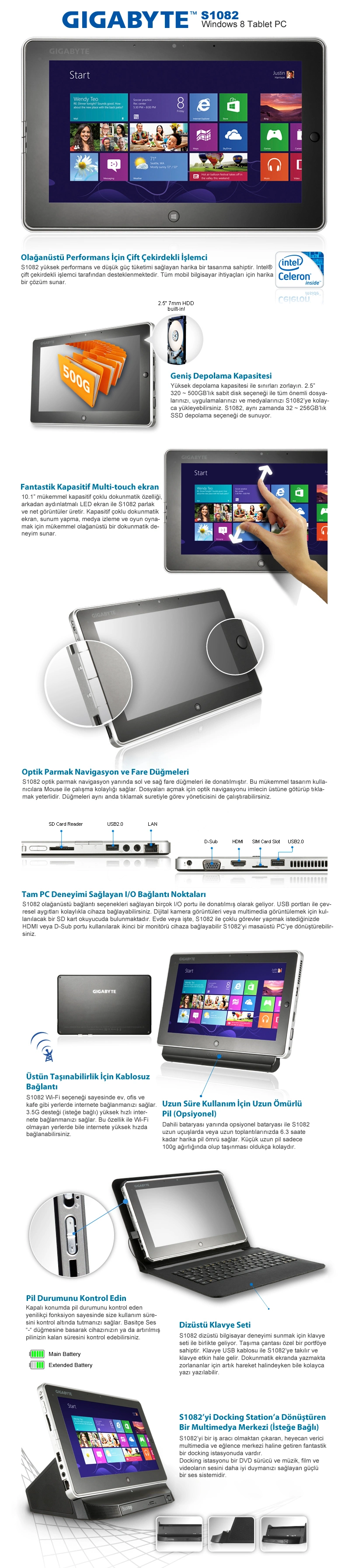 Gigabyte S1082 128 SSD 3G Tablet Özellikleri