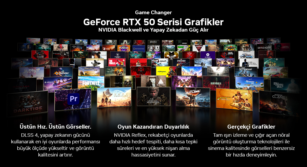 - Üstün Hız. Üstün Görseller: DLSS 4, yapay zekanın gücünü kullanarak en iyi oyunlarda performansı büyük ölçüde yükseltir ve görüntü kalitesini artırır.