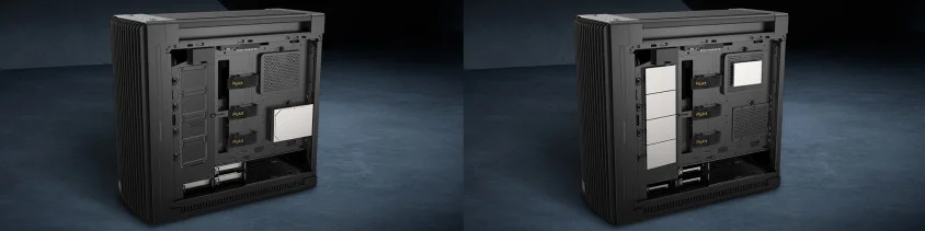 Asus ProArt PA602 kasada dört adet 3 5″ HDD yuvası ve sekiz adet 2 5″ SSD yuvası bulunmaktadır ayrıca toplam 8 genişleme slotu ve iki dikey GPU montaj alanı sayesinde kapsamlı depolama ve bileşen desteği sunar