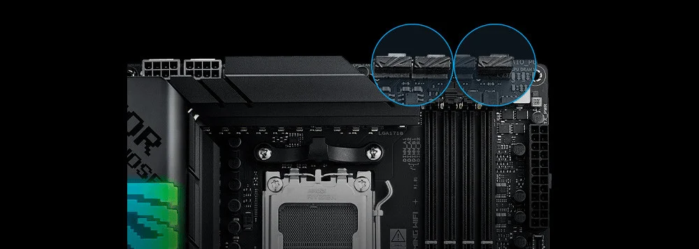 Bu anakart 4 x DIMM yuvasıyla toplamda 192 GB'a kadar DDR5 8000+(OC) MHz belleği destekler. Ayrıca AMD EXPO ve ASUS AEMP teknolojileri ile bellek performansını optimize eder.