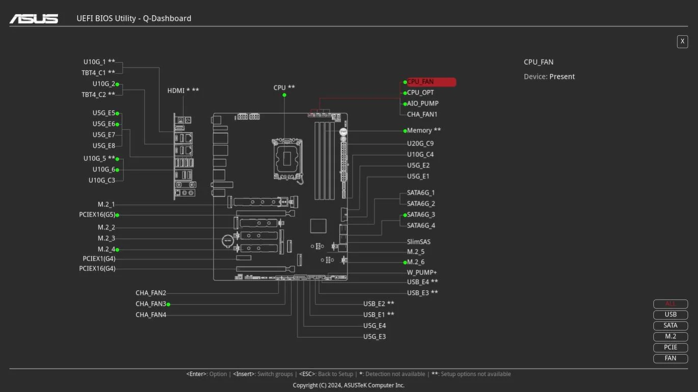 Asus ROG Strix X870-F Gaming WiFi anakartta 1 x 4-pin CPU Fan başlığı, 1 x 4-pin CPU OPT Fan başlığı, 1 x 4-pin AIO Pompa başlığı ve 5 x 4-pin kasa fanı başlığı bulunmaktadır. Bu sayede geniş bir soğutma desteği sunar.