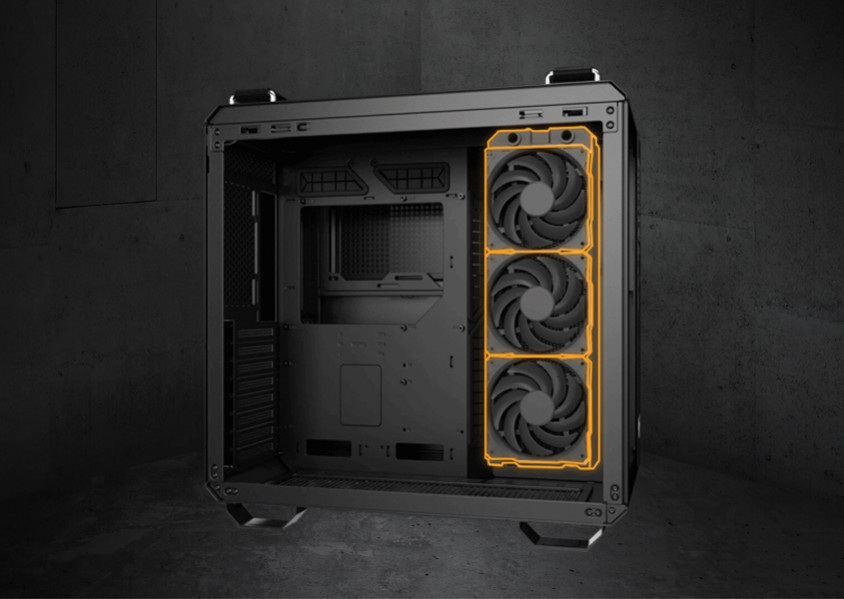İki adet USB-A bağlantı noktasına ek olarak, TUF Gaming GT502’nin ön paneli 10 Gbps’e varan aktarım hızları için hazır durumda olan USB 3.2 Gen 2 Type-C bağlantı noktası sunuyor.