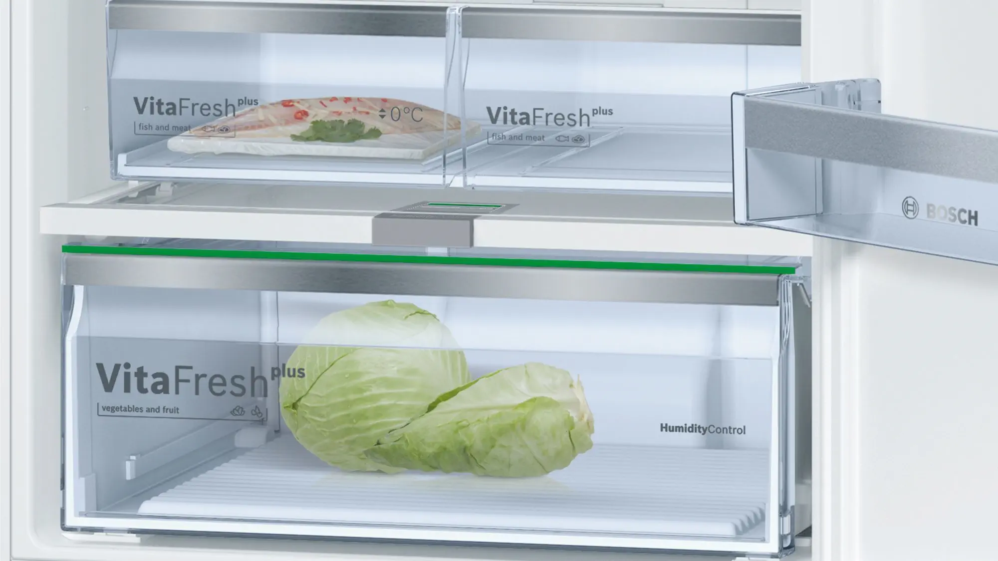 • Ayarlanabilir nem kontrol mekanizmasına sahip sürgülü ve tamamen kapanabilen VitaFresh plus çekmecesi sayesinde meyve ve sebzeler en uygun nem oranında iki katına kadar daha uzun süre taze kalır.